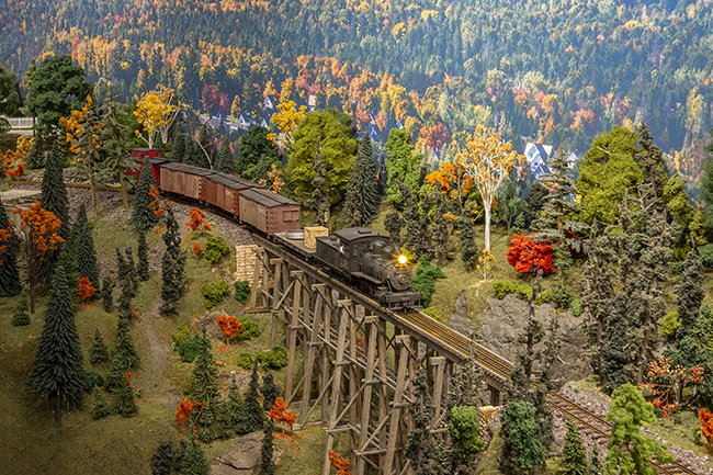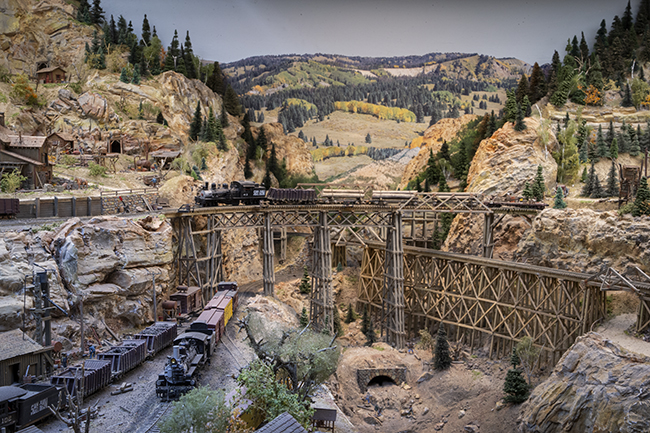 Hard rock mining is the theme of this Colorado based 100% photo complete layout featuring two levels of dramatic vertical scenery. Hand painted backdrops, tall bridges and deep canyons that dwarf the narrow gauge trains fill the room.