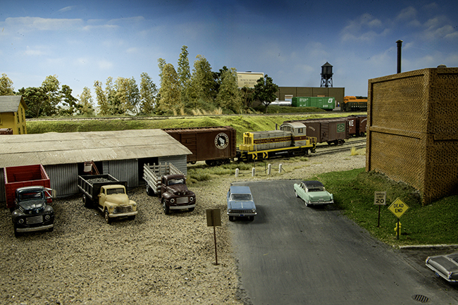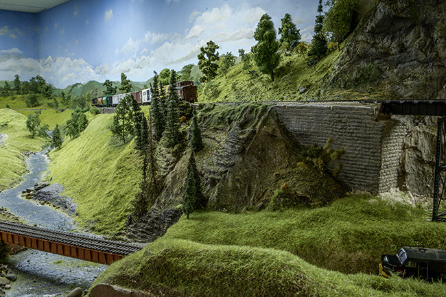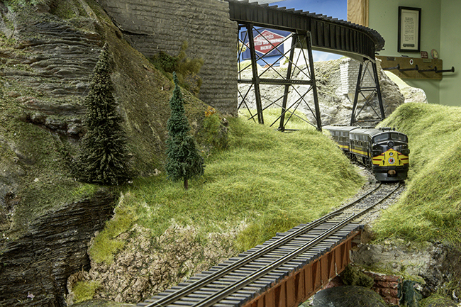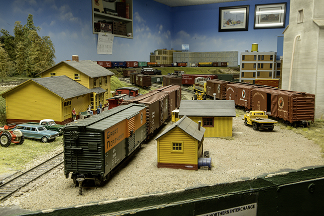 This large layout features two long routes that circle the basement which allows for long trains to run. Within this circle are four distinct railroad operations which include an active staging area, the 27th Ave industrial area, a downtown switching area which includes an interchange yard and Heartland Junction where the Minnesota Heartland leaves the main to work the small but busy prairie towns of Grey Eagle and Centralsoda.