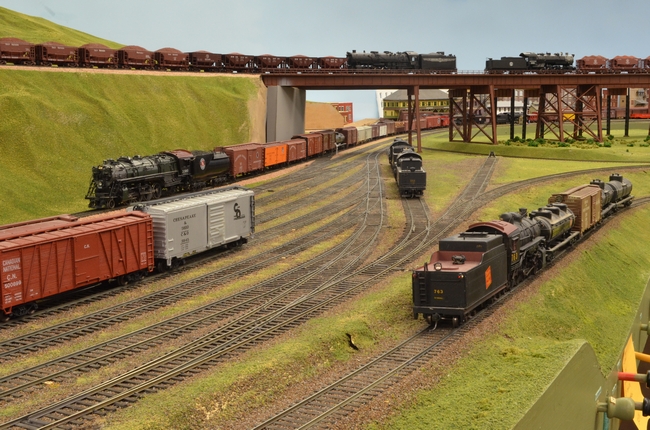 The Missabe Northern is a large double-deck railroad designed for diverse freight, iron ore and passenger operations as found in Minnesota in the early 1940’s. The Duluth ore docks are the first scene you see as you enter this 3700 sq. ft. empire. Iron ore is classified and sorted by ship and ore dock pocket in the Proctor yard on the ‘hill’ and brought down to the docks in a prototypical manner. Back-EMF and sound decoder controlled steam engines perform realistically on over 4000 feet of hand laid track and 570 scratch built in place turnouts. GN and DMIR power dominate switching and mainline action that includes interchanges with eight other working railroads. Sign up early to join in a structured, friendly operating session using car cards and waybills. This layout was featured in 2013 Model Railroad Planning and many other hobby publications.