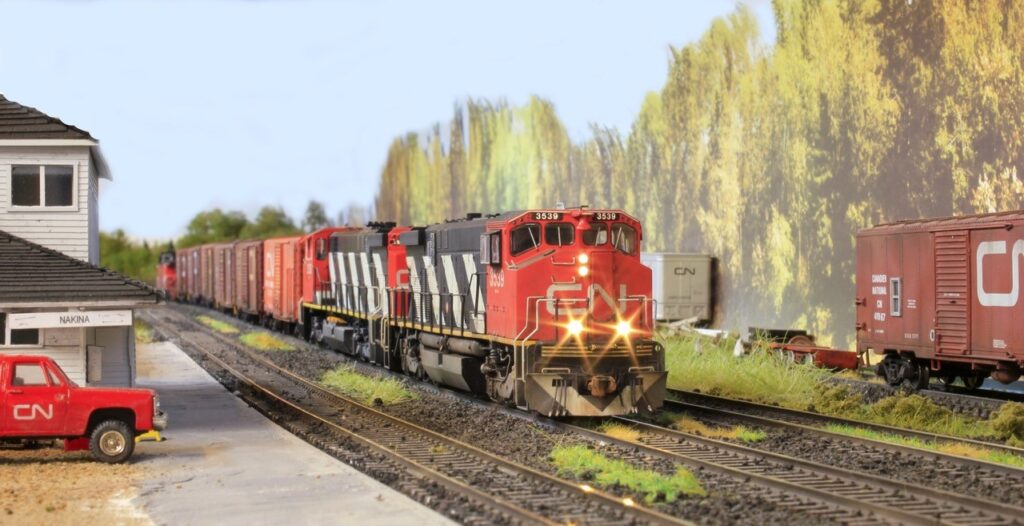 This large double decker layout captures mainline railroading in the mid 1990’s. This 100% photo complete layout represents a portion of the Canadian National Railway transconental Route, focusing on the Caramat Subdivision in Northwestern Ontario Canada. The layout is built for operations, with operational CTC, a dispatcher and radio communications.