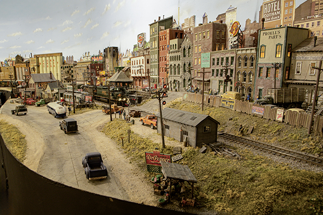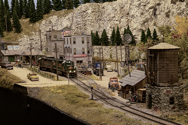 This fantastic layout first appeared in the February, 2009 issue of Model Railroader and most recently is featured for the month of April in the NMRA™ 2026 calendar. This freelance railroad contains many highly detailed scenes featuring high bridges and urban settings that are sure to peak your interest. Animation is everywhere on this layout, such as an operating Griswold grade crossing signals and numerous interior lit structures. The overall cohesiveness of the entire layout is well worth seeing.