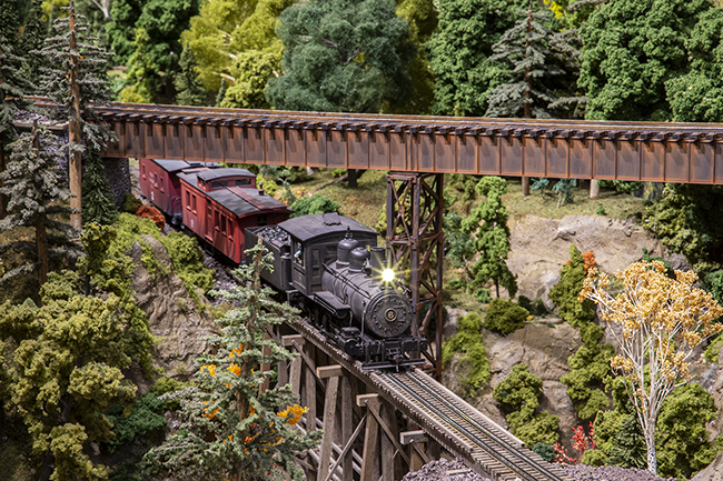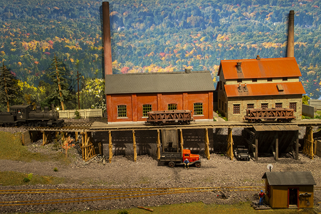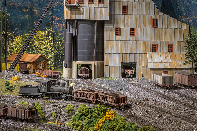 The On30 Quincy and Torch Lake Railroad occupies 800 square feet and represents the wooded areas of upper Michigan in 1942. World War II is on and the railroad is extremely busy serving the Quincy Mine hauling rock embedded with copper to its mine buildings and local customers. The mines, mills, lake, and the six miles of track that connected them all are modeled. All of structures and scenery are completed to photo finish. Most structures are supper detailed as well. As you follow along the main, you will pass hundreds and hundreds of trees on the layout and a very well-done photo backdrop to extend the view into the distance. Locomotives feature sound; Keep Alive and extreme kit-bashing as featured in past issues of the Narrow Gauge and Short Line Gazette magazine.