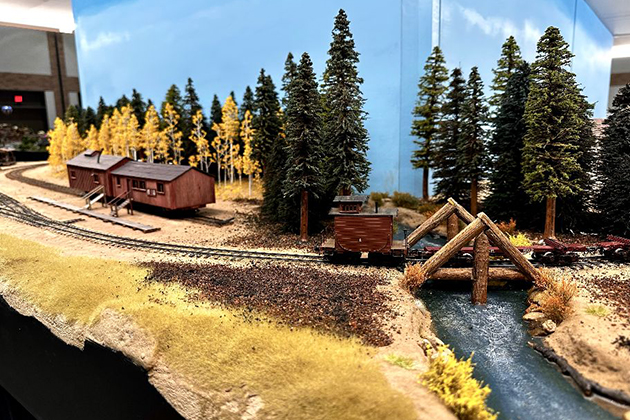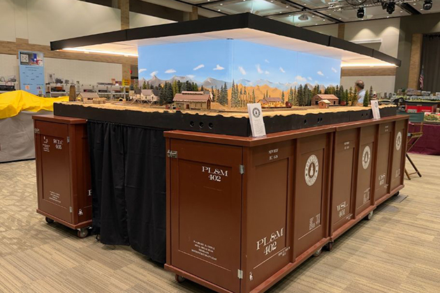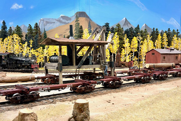 The Rush Creek Lumber Company is a logging themed railroad that was constructed with the assistance of multiple MMRs®. This modular layout features a small saw mill, an engine house and turntable, log cutting and loading scenes and a nicely done hand-painted backdrop. This portable layout features a number of construction techniques which allows for the layout’s modules and additional items to be stored in the rolling cabinets that also serve to support the layout when it is being displayed. The self-supporting roof includes the use of 3500K LED strip lighting to illuminate the layout for unobstructed photography.