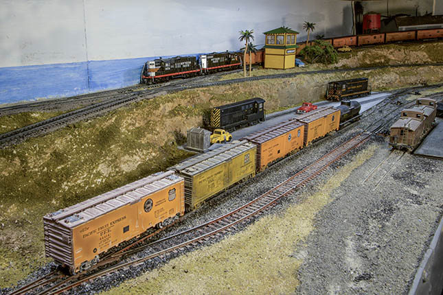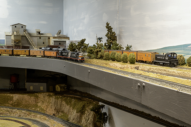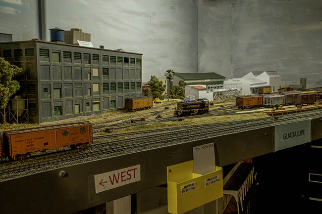 The Santa Maria Valley Industrial Railroad models the movement of southern California produce from farmer’s fields to store shelves. This double-deck layout is designed for operations and focuses on all aspects of the service cycle of refrigerator cars in the 1950’s that keeps the nation fed. The affiliated Southern Pacific Coast Line short line railroad centers on the Santa Maria Valley of California. This classic layout is built with ample room for operators to view their consist as the trains move around the system.