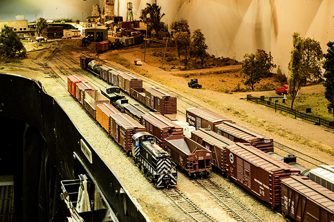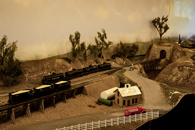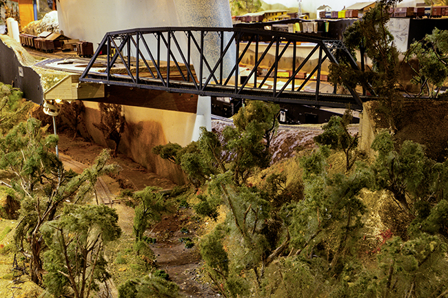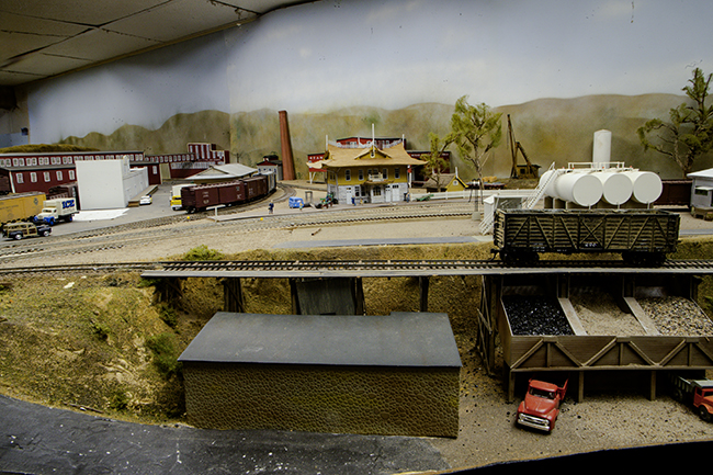 This large, multi-level layout is a point-to-point branch line railroad set in the California “Mother Lode Country” in the early 1950s. The Sierra railroad connects the Hetch Hetchy, West Side Logging Company and Pickering Lumber Company railroads with the Southern Pacific and Santa Fe railroads at Oakland, California to serve the local industries from the valley to the mountains. This classic layout has been in continuous dispatched weekly operation since the 1980’s and has over 500 feet of mainline with branch lines on two levels.