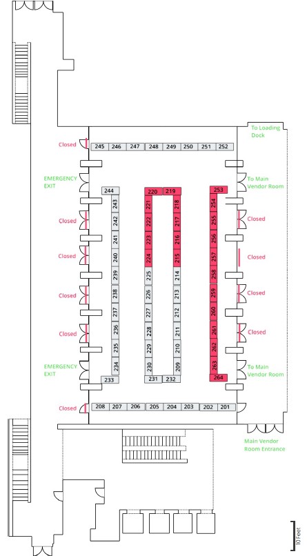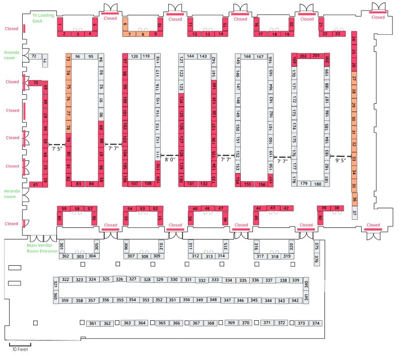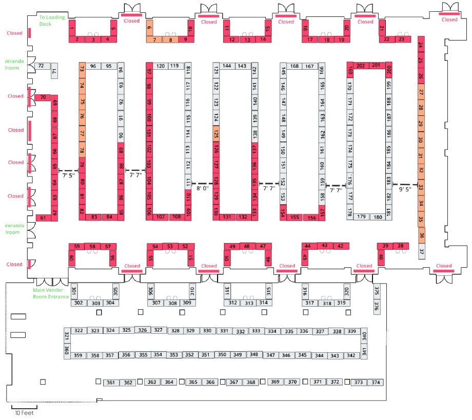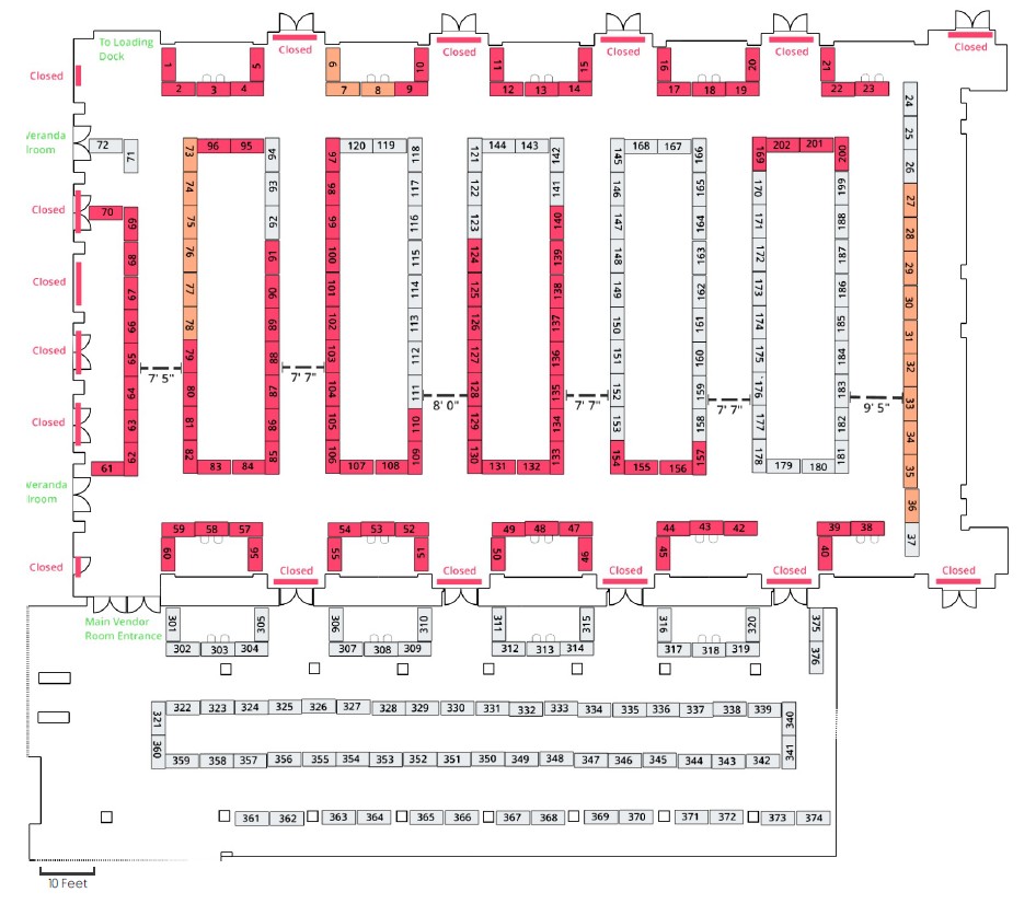 Table Selection – The vendor room maps below show available tables in gray. From these tables, select both the number of tables you desire to reserve and their table numbers. During the vendor registration process, you will only be able to select the number of tables you wish to reserve. Once you’ve completed your registration process, you will receive a confirmation email that will contain instructions as to how to complete the selection of the actual table numbers that you desire.